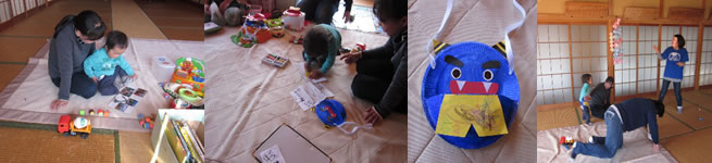 またこの日は節分だったので、「まめまき」の歌をうたい、紙をまるめたものを豆に見立てて豆まきをしました。子どもたちにとっては初めての豆まき、鬼のお面にびっくりしながらもママにうながされて豆を投げていました。