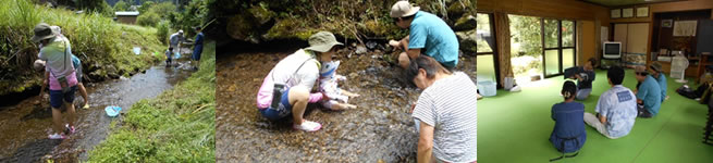会館前の小川で水遊びをしました。こどもたちはパパやママと一緒にペットボトルシャワーやじょうろで遊んだり、泳いでいるお魚や貝やカニを見つけました♪