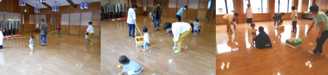 自由遊びの時間には、ホールいっぱいにボールを出して体を沢山使って遊びました♪