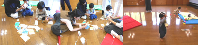 スキンシップサークルの関みかさんとたくさん体を動かして遊んだ後、親子で宝さがしをしました。こどもたちが、マットや椅子の下にかくれている動物の絵カードをどんどん見つけて、あっという間に24枚のカードを全部発見!宝さがしがとっても上手だね♪
